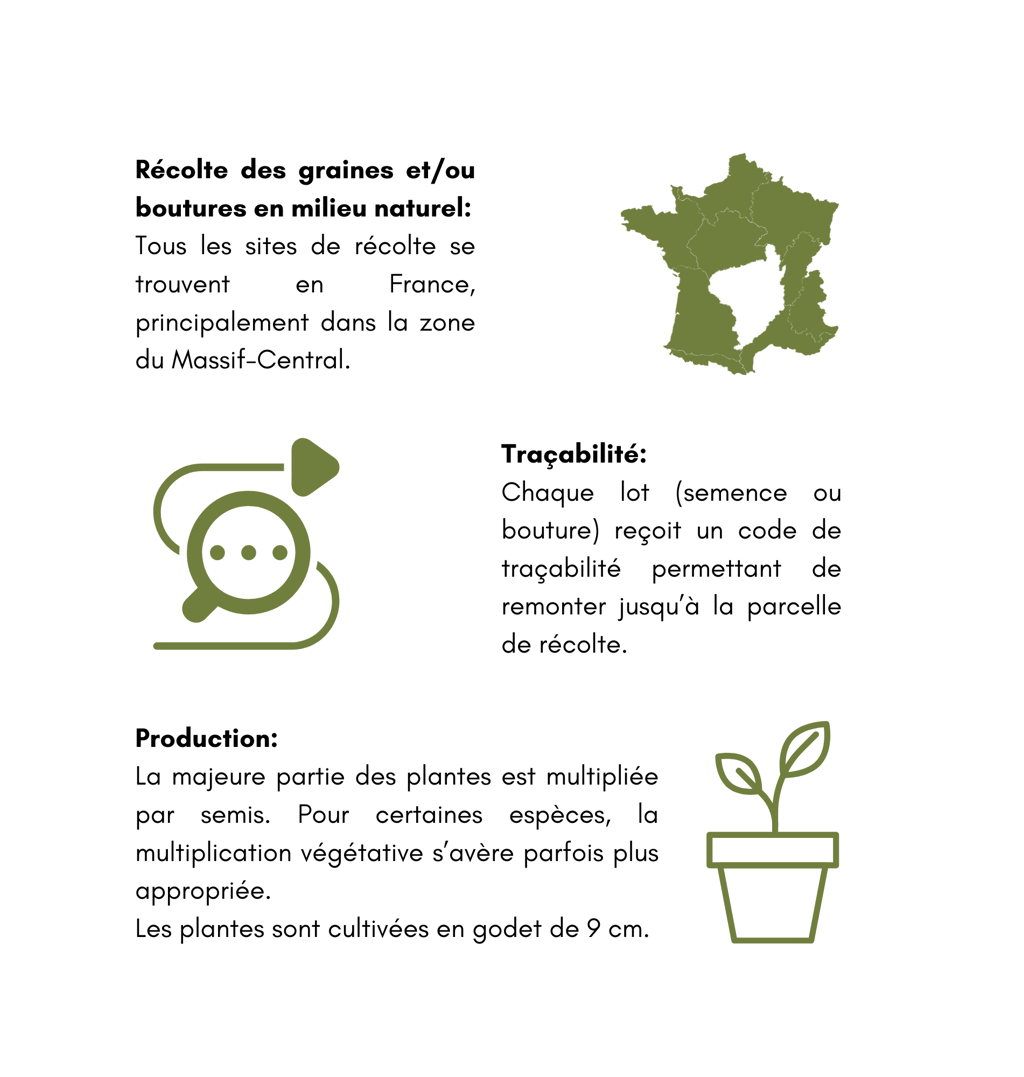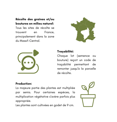 Un des principaux enjeux dans le cadre de projets de plantations d'espèces indigènes est la maîtrise de la traçabilité. Nous veillons à assurer cette traçabilité tout au long du processus de fabrication, de la collecte à la plantation.