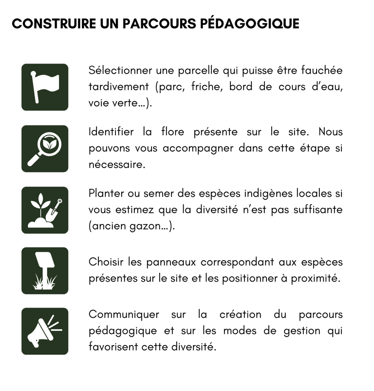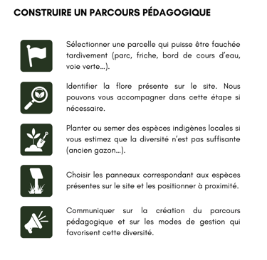 Le potentiel pédagogique des espaces verts est sans limite ! Qu’il s’agisse d’un massif de plantes indigènes, d’une zone gérée en fauche tardive ou de tout autre endroit entretenu de manière extensive, il y aura toujours une histoire à raconter sur le vivant qui occupe ces espaces.