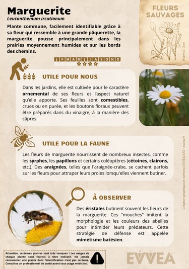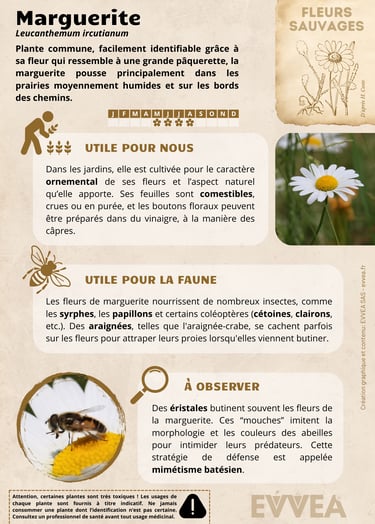 La gamme de panneaux de communication sur la flore d’EVVEA présente des plantes communes, banales, que nous croisons tous les jours sans les remarquer. Aussi insignifiantes puissent-elles paraître, même ces espèces peuvent nous émerveiller ! Savoir que l’ortie est nécessaire pour les chenilles de certains papillons ou que certaines fleurs favorisent des prédateurs de pucerons peut nous aider à changer de regard sur ces plantes et nous permettre de mieux cohabiter avec elles.