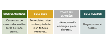 Pour faciliter leur usage, les plantes sont classées par rapport aux différentes typologies d’habitats trouvés en milieu urbain. Les espèces listées ont été sélectionnées pour leur robustesse, leur intérêt pour les pollinisateurs et leur aspect ornemental. Ce dernier critère est primordial dans le cadre d’aménagements urbains pour favoriser l’acceptation des usagers et leur permettre d’adhérer à la démarche.