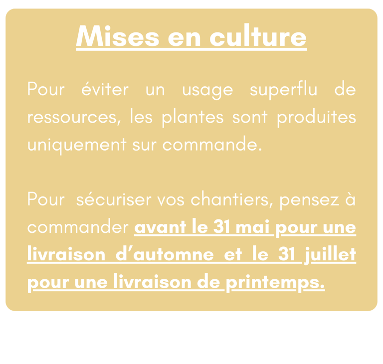 Les plantes listées dans ce document sont celles pour lesquelles il est possible d’engager des productions à court terme. Dans le cas où vous auriez des besoins spécifiques, n’hésitez pas à nous contacter pour étudier la mise en place d’un plan de collecte adapté à vos besoins.